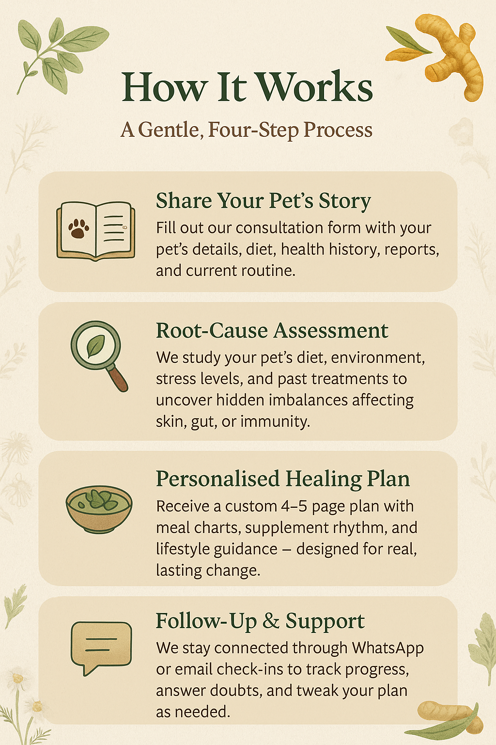 That experience changed everything. For over a decade, I’ve worked with pets for their chronic skin, gut, joint, allergy & many other issues — using simple food, herbal support, and lifestyle guidance.